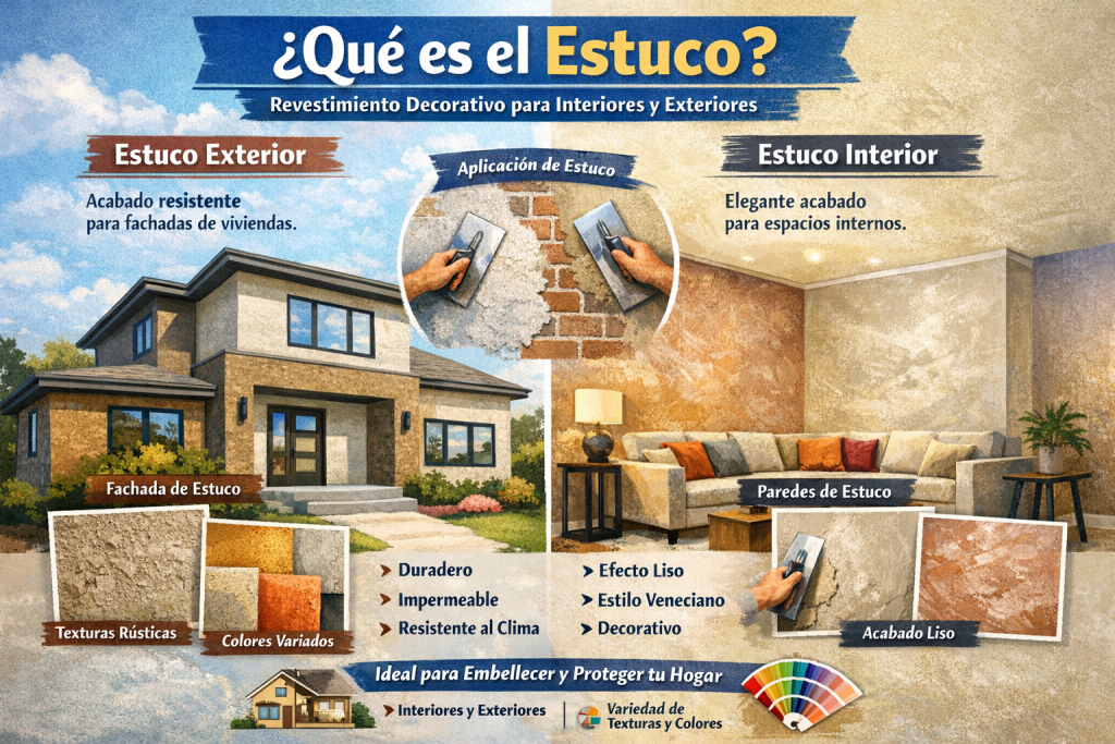 El estuco es un revestimiento decorativo y protector que se aplica sobre paredes y techos, tanto en interiores como en exteriores. Está compuesto por una mezcla de cal, cemento y pigmentos, y permite lograr acabados lisos o texturizados con gran resistencia y durabilidad. Además, aporta elegancia y estilo a cualquier espacio, mejorando la apariencia de superficies y protegiéndolas frente a la humedad y el desgaste.